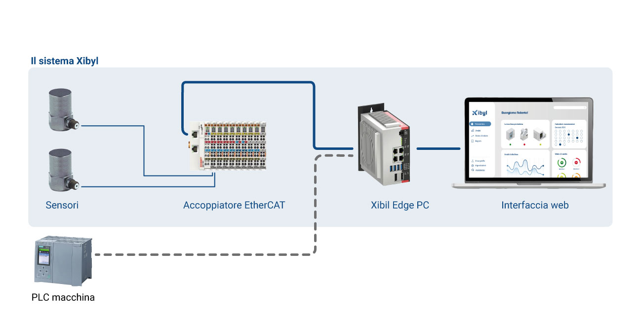Xibyl può essere equipaggiato con una gamma di sensori installati appositamente in base alle esigenze (vibrazione, temperatura, corrente, etc.) oppure collegarsi ai PLC già presenti sull’impianto, leggendo i segnali che l’impianto stesso genera.